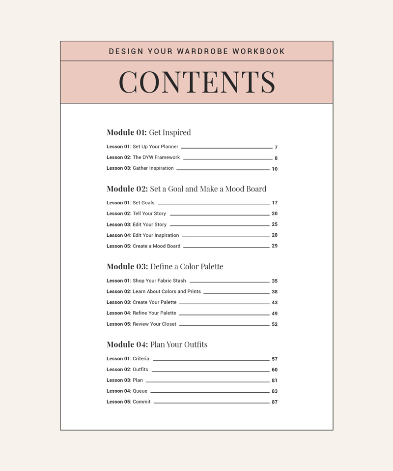 This book walks you through the entire course. It includes all the reading and homework to design your own collection. This course is written so you can take it whenever you'd like, or you can participate in one of our wardrobe parties.