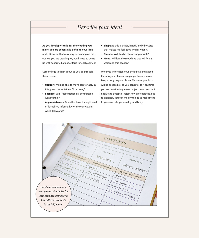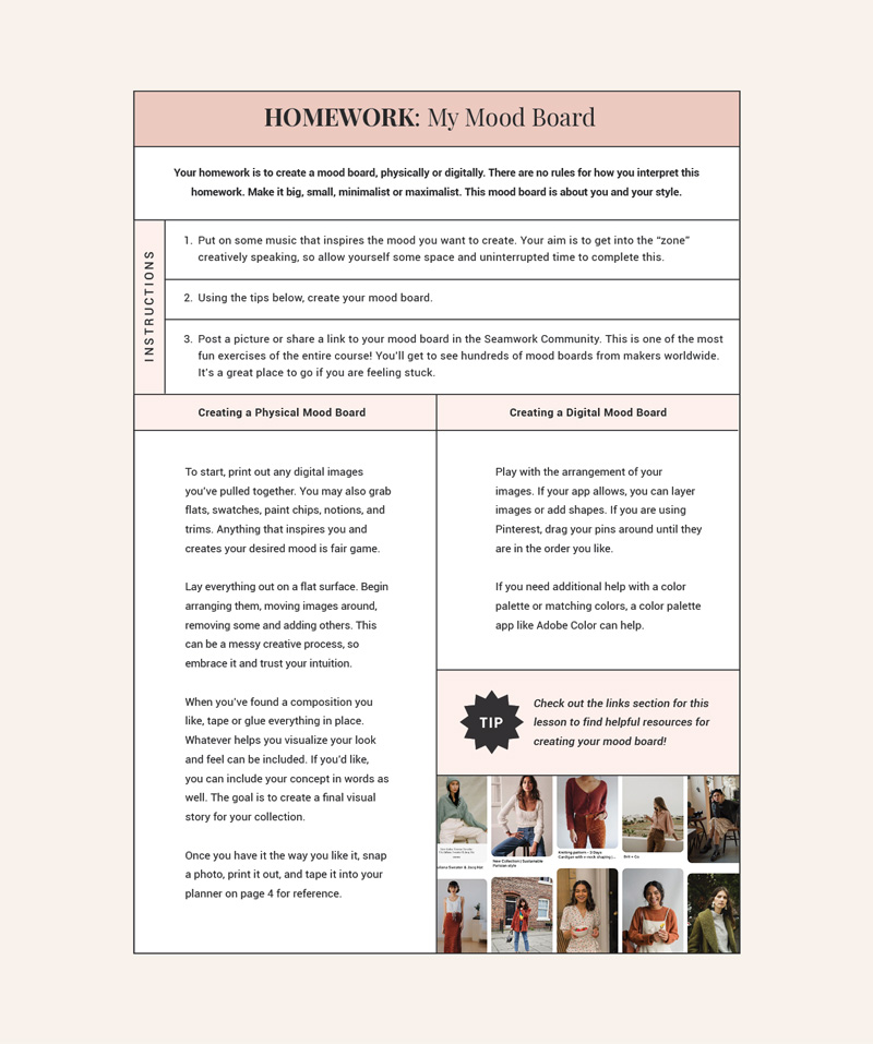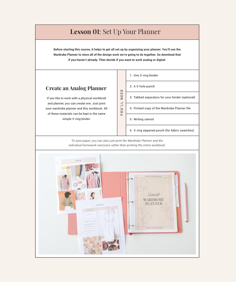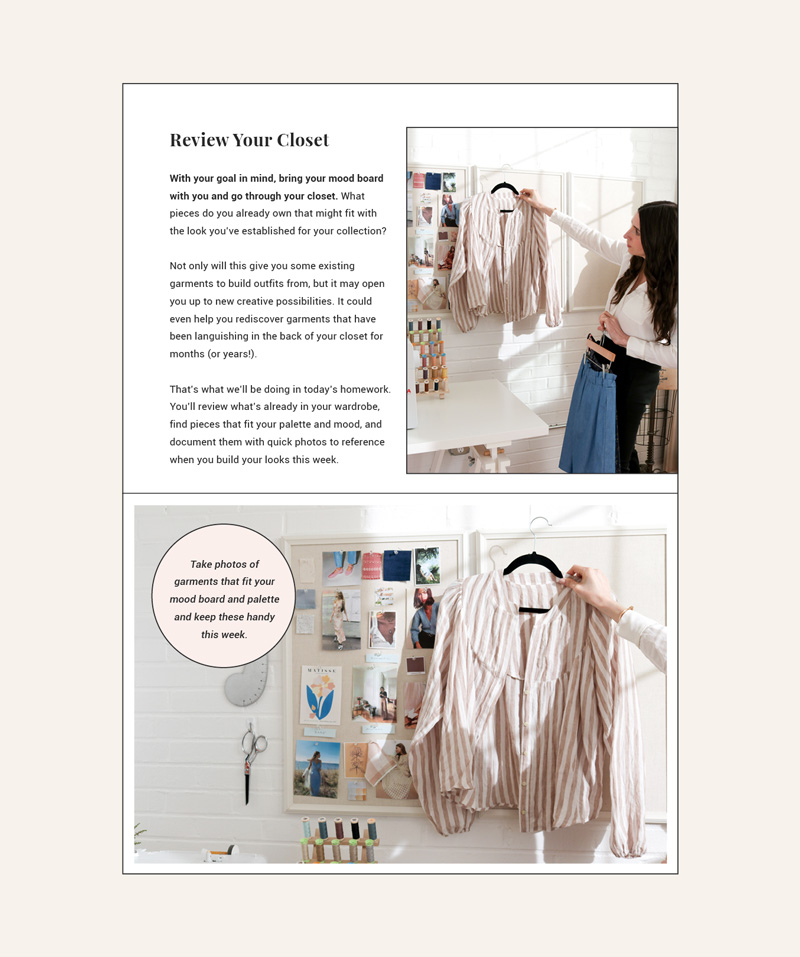 In each lesson, you’ll do a quick activity. These exercises will help you explore your style, play with inspiration and fabric, and organize your ideas so you can prioritize your sewing.