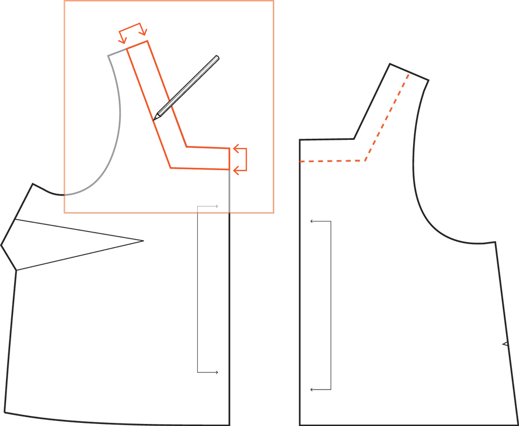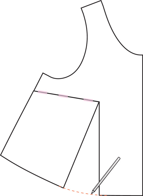 02 | Measure down along the side seam about 2”. Draw a slightly curved line from the side seam to the center front. Straighten the line as you approach the center front so it’s perpendicular to the center front line.
