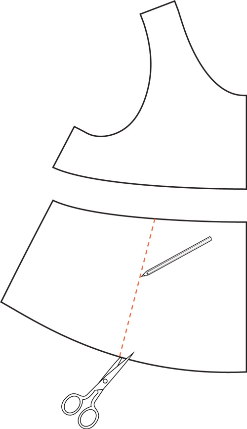 05 | To create the gathered body, draw a line on the bottom portion of the front, from the center of the hem to the center of the top cut line.