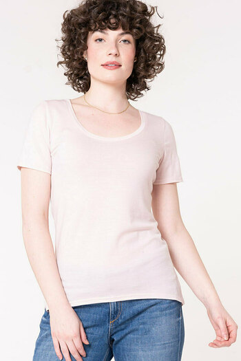 Light to medium weight knit fabrics with at least 50% stretch, such as cotton, rayon, bamboo jersey, rib knits, and thermal knits.