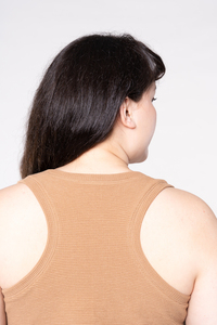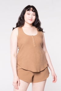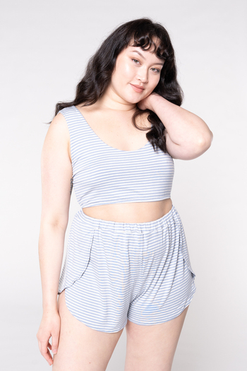 Jamie is wearing a size 12 curvy Cal tank and size 14 curvy Cal shorts lengthened by 1 1/2". Her measurements are 41 1/2", 34", 46 1/2", and she is 5'10".