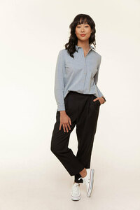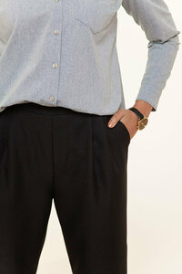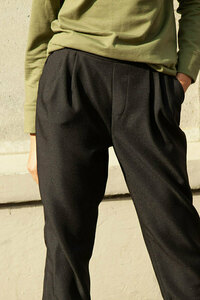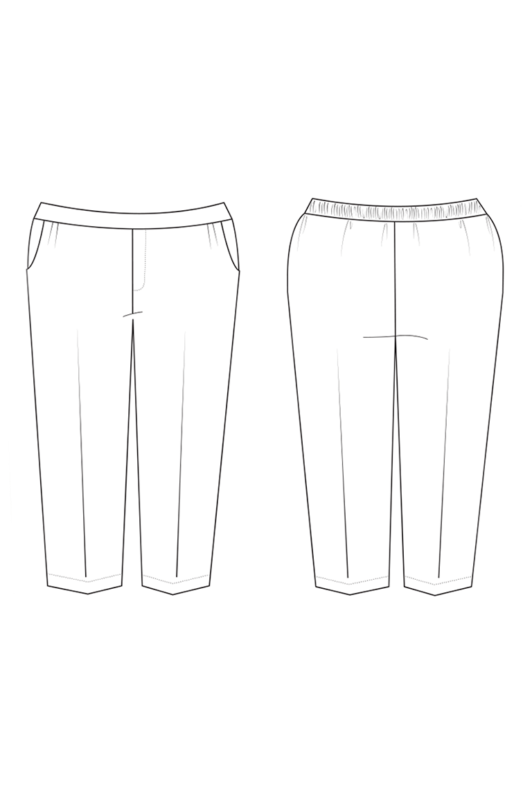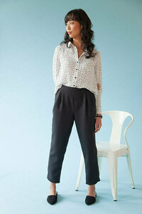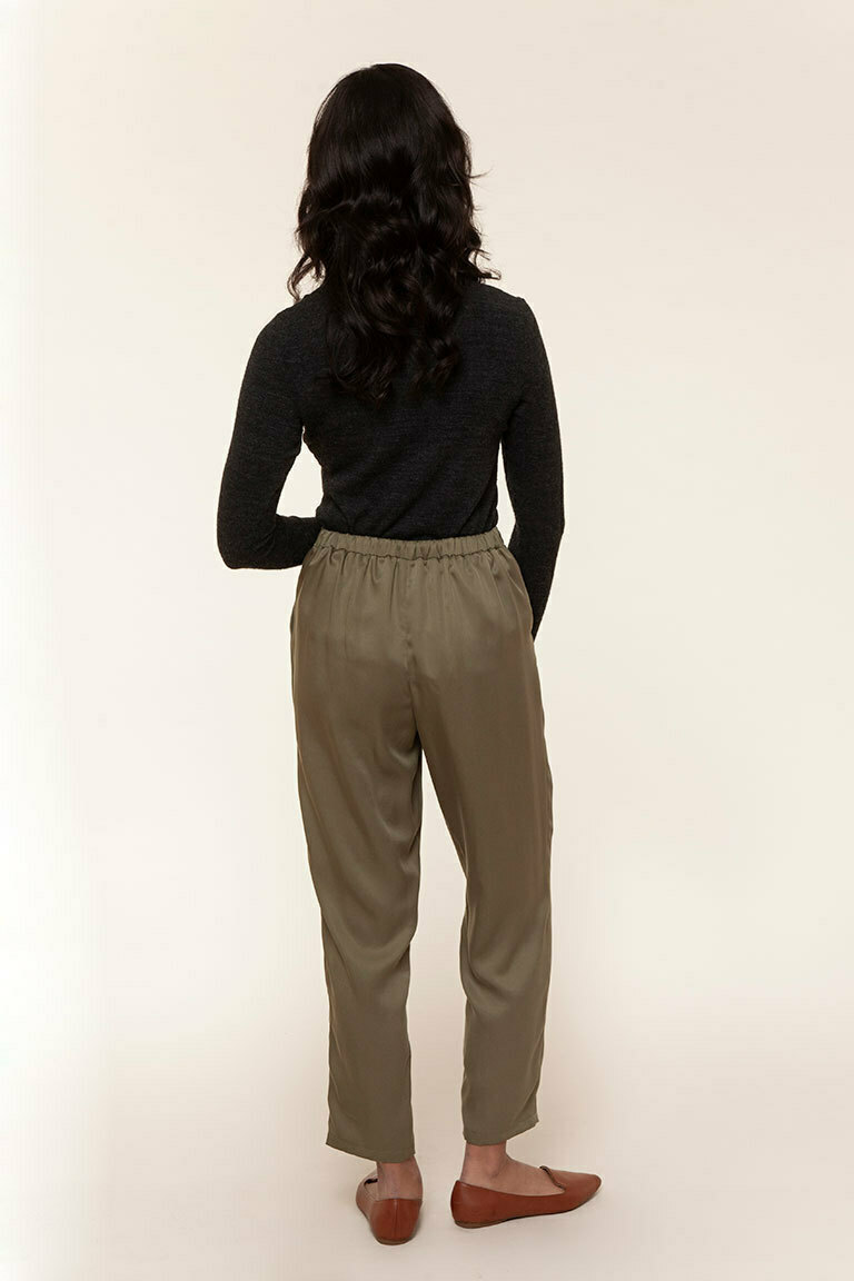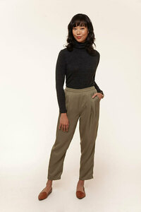 The Channing pants are a modern, relaxed wardrobe staple, perfect for your favorite woven fabrics, from chino or linen to wool. Mid-rise with a tapered leg, they also feature front pleats, a faux fly, slash pockets, and a fitted waistband with elastic at the back. The hem sits right above the ankle.