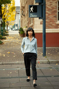 Kristi is wearing size 6 Channing pants, shortened by 1/2”. Her measurements are 33”, 27 1/2”, 28”.