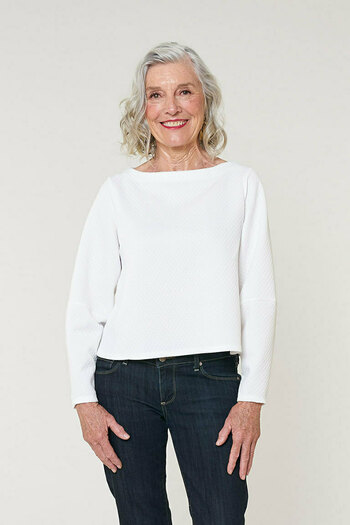 Sophia is wearing a size 2 Goldie tee lengthened by 1” (2.5 cm). We also did a broad shoulder adjustment and added 2” (5.1 cm) to the sleeve length. Her measurements are 33 1/4" (85.7 cm), 25 1/4”, and she is 5'8" (1.73 m) tall.