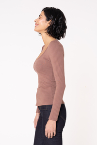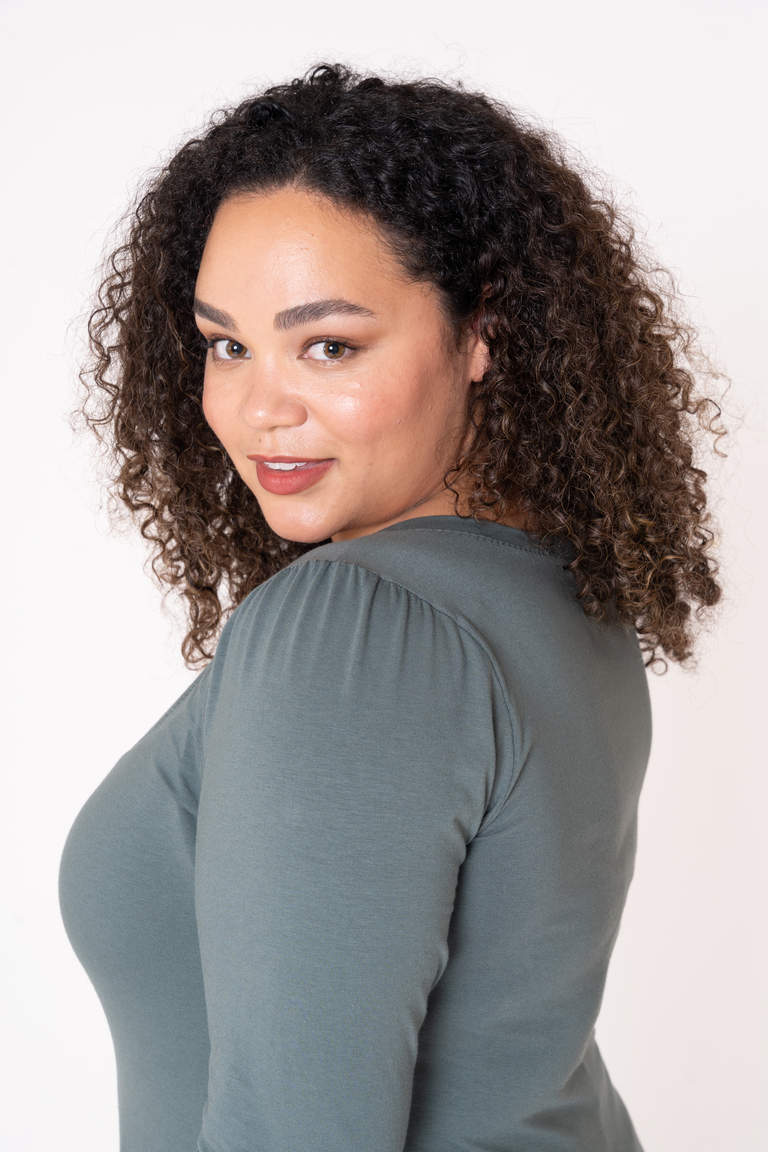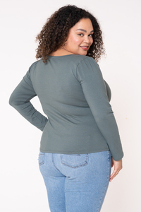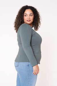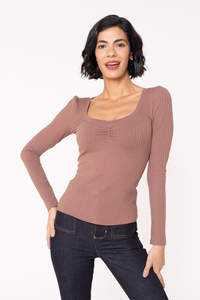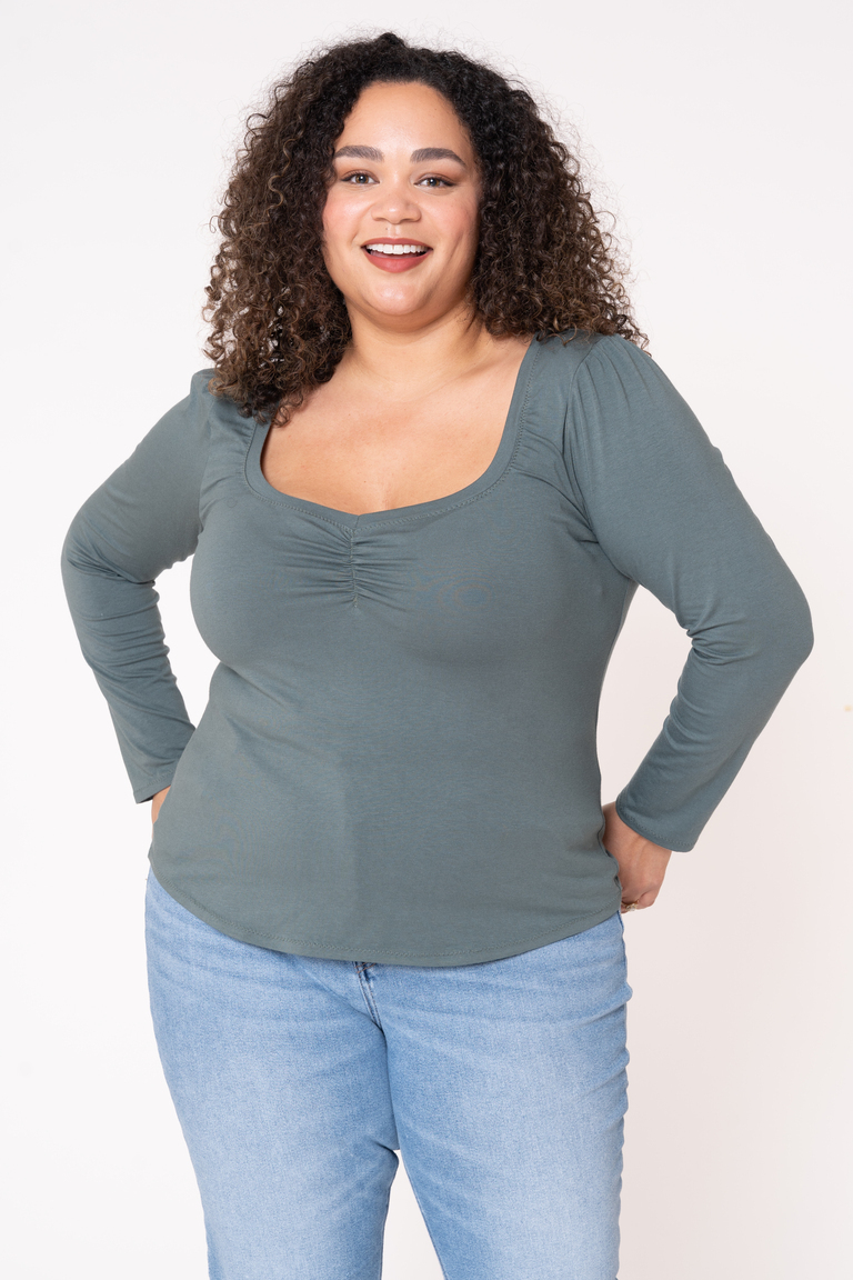 Meet Goldie! This tee has a wide sweetheart neckline cinched with elastic at the center front. It has a fitted silhouette with full-length sleeves that are slightly gathered at the top. Goldie can be layered under or over, but it shines bright as the star of your outfit, especially when paired with your favorite necklace.