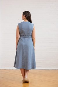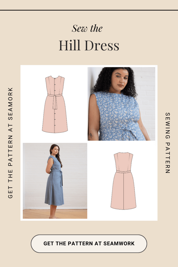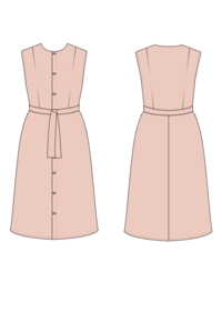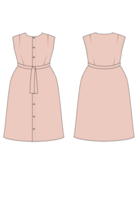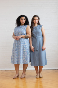 Add a touch of vintage charm to your wardrobe with the Hill dress. This button-front dress features a high, round neckline, slightly extended shoulders, and an A-line skirt. Waist and shoulder darts on both the front and back bodice offer a flattering, tailored fit and the waist tie provides additional definition. The faced neckline and center front add a polished finish, while in-seam pockets offer practicality. Sew this timeless dress in a floral lawn for the ultimate sundress or make it in linen to let the details and silhouette shine.