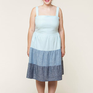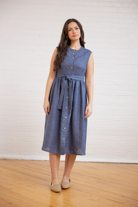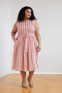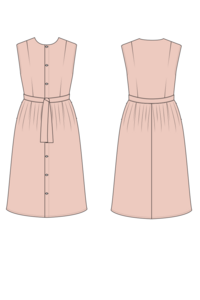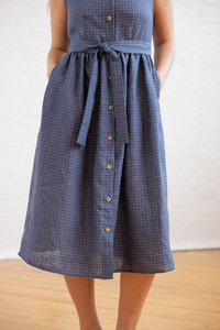 Add a touch of vintage charm to your wardrobe with the Hill dress. This button-front dress features a high, round neckline, slightly extended shoulders, and an A-line skirt. Waist and shoulder darts on both the front and back bodice offer a flattering, tailored fit and the waist tie provides additional definition. The faced neckline and center front add a polished finish, while in-seam pockets offer practicality. Sew this timeless dress in a floral lawn for the ultimate sundress or make it in linen to let the details and silhouette shine.