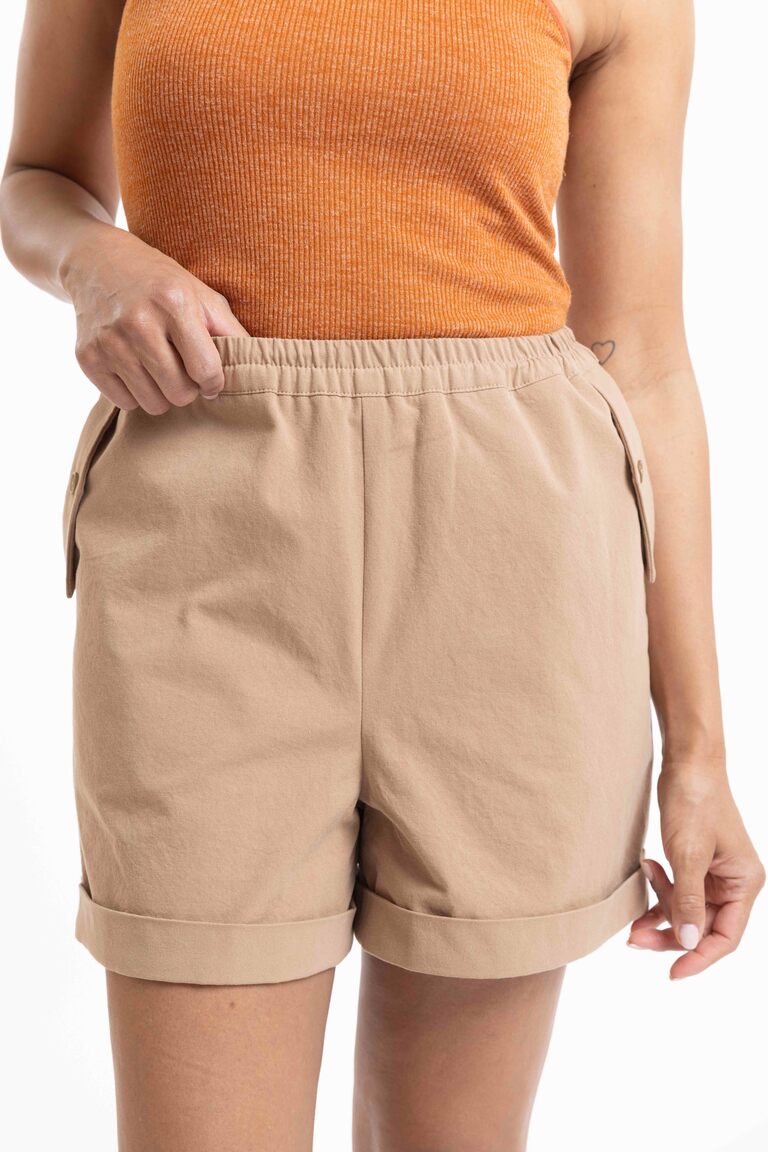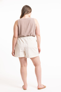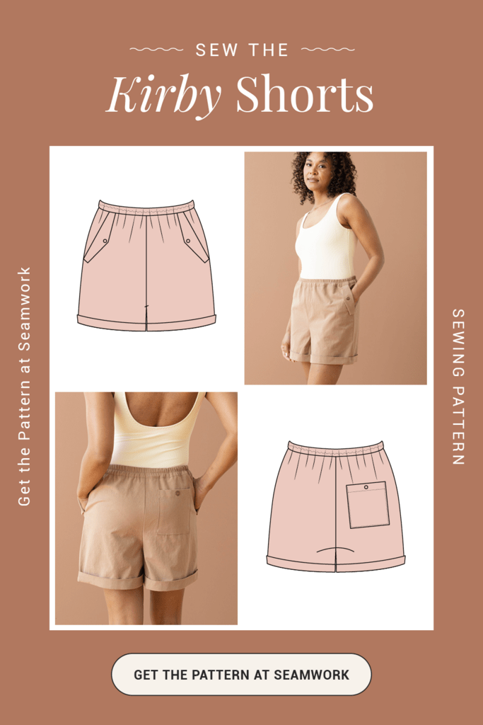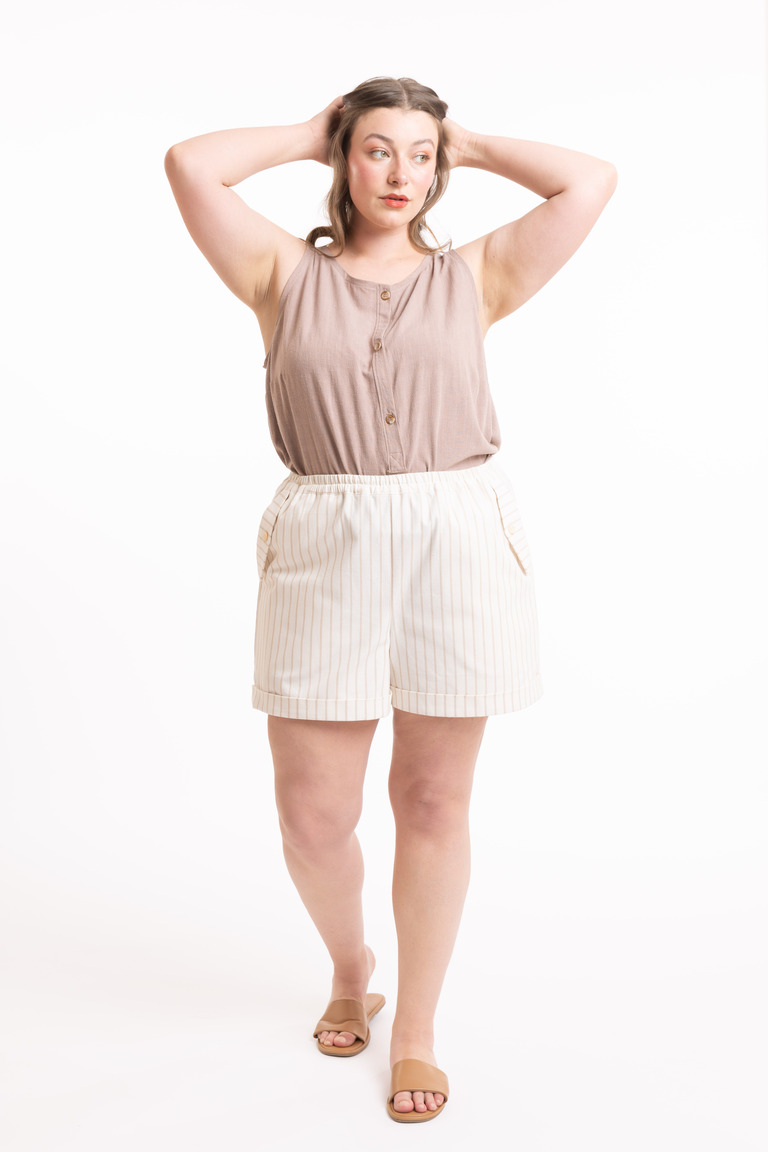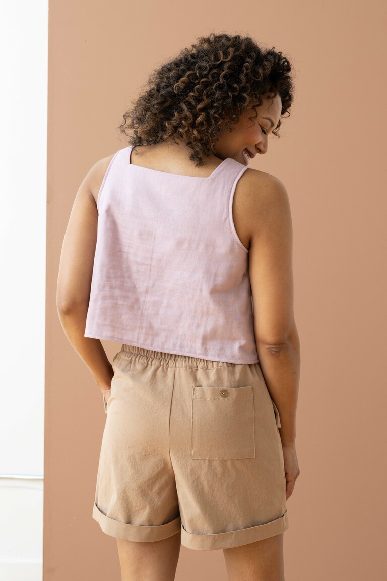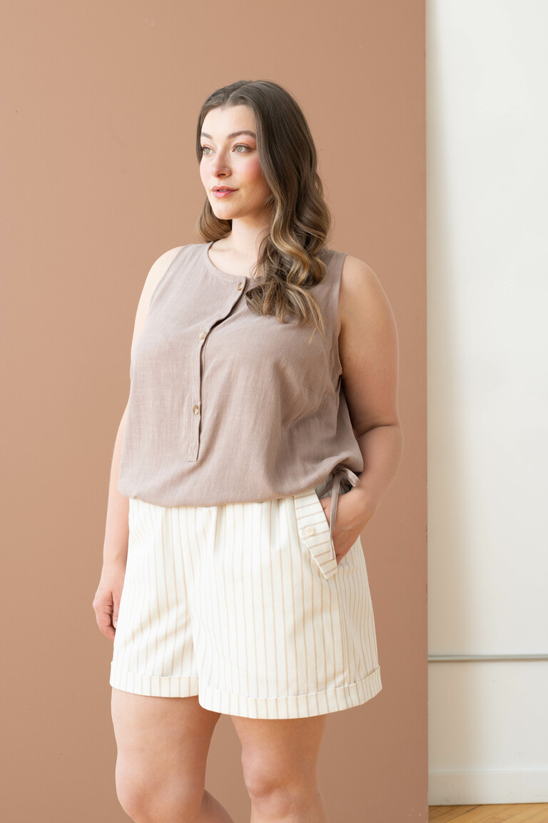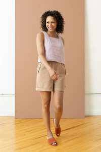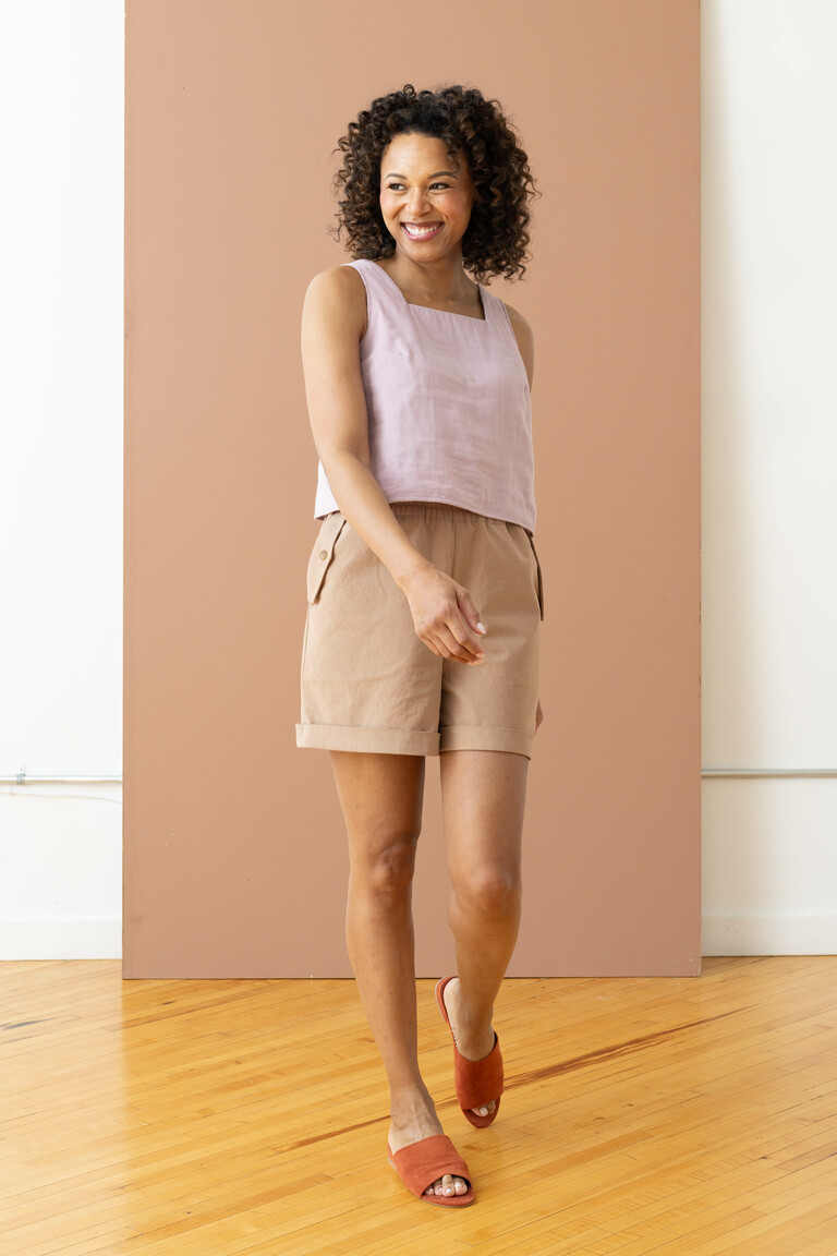 Medium weight woven fabrics such as cotton twill, linen, linen blends, denim, chambray, and rayon twill. Felicia is wearing Kirby in a Tan Softened Organic Cotton and Crosby is wearing Kirby in a Cotton Striped Canvas.