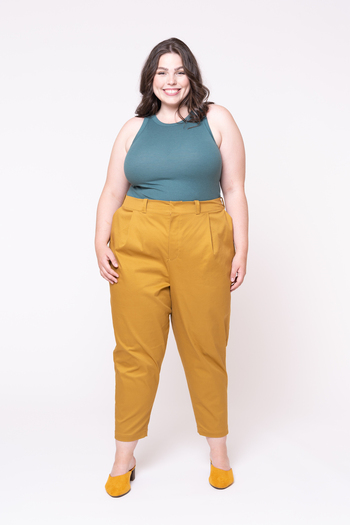 Franki is wearing Lars sewn in a stretch twill. We paired it with the Cedar sweater by Sew North.