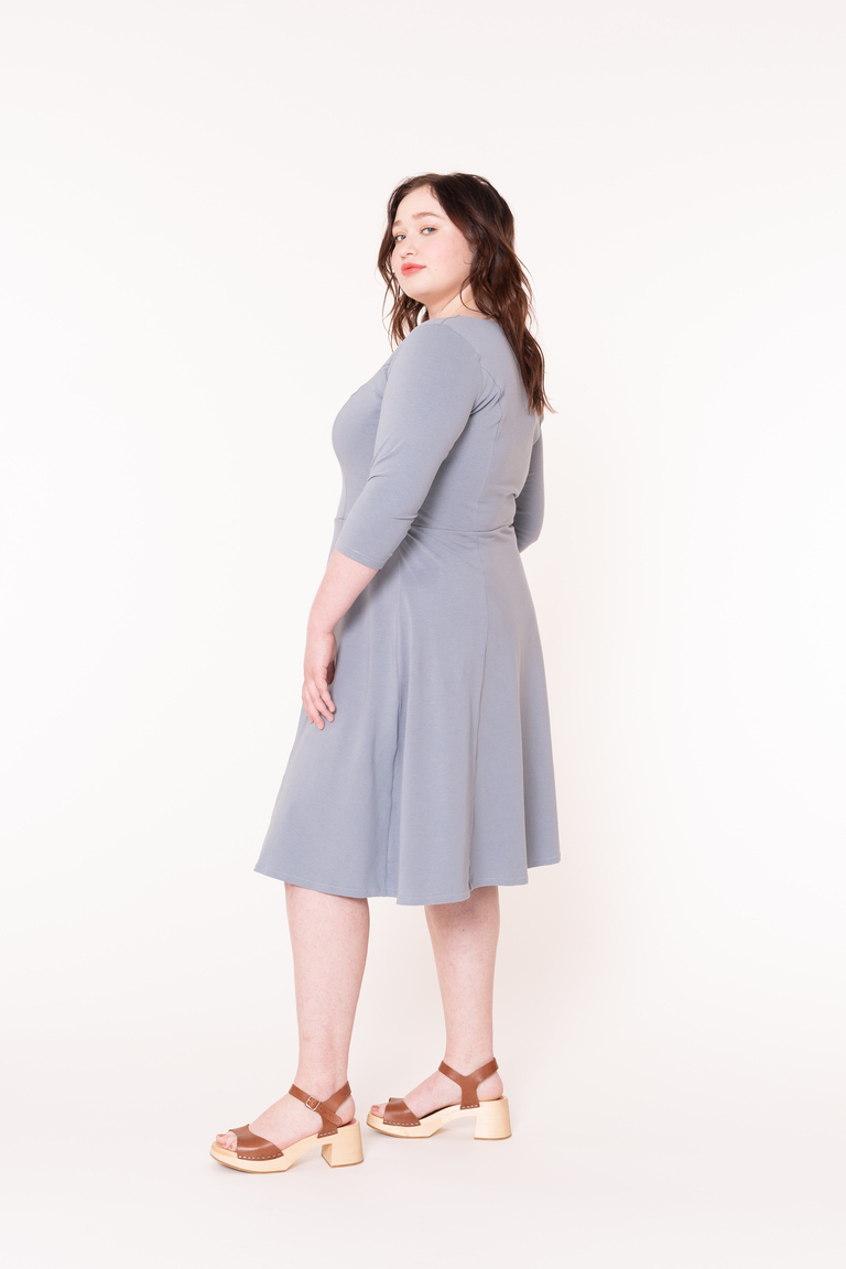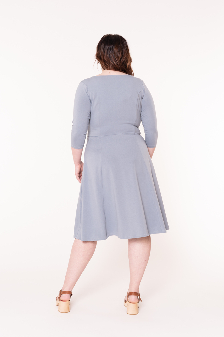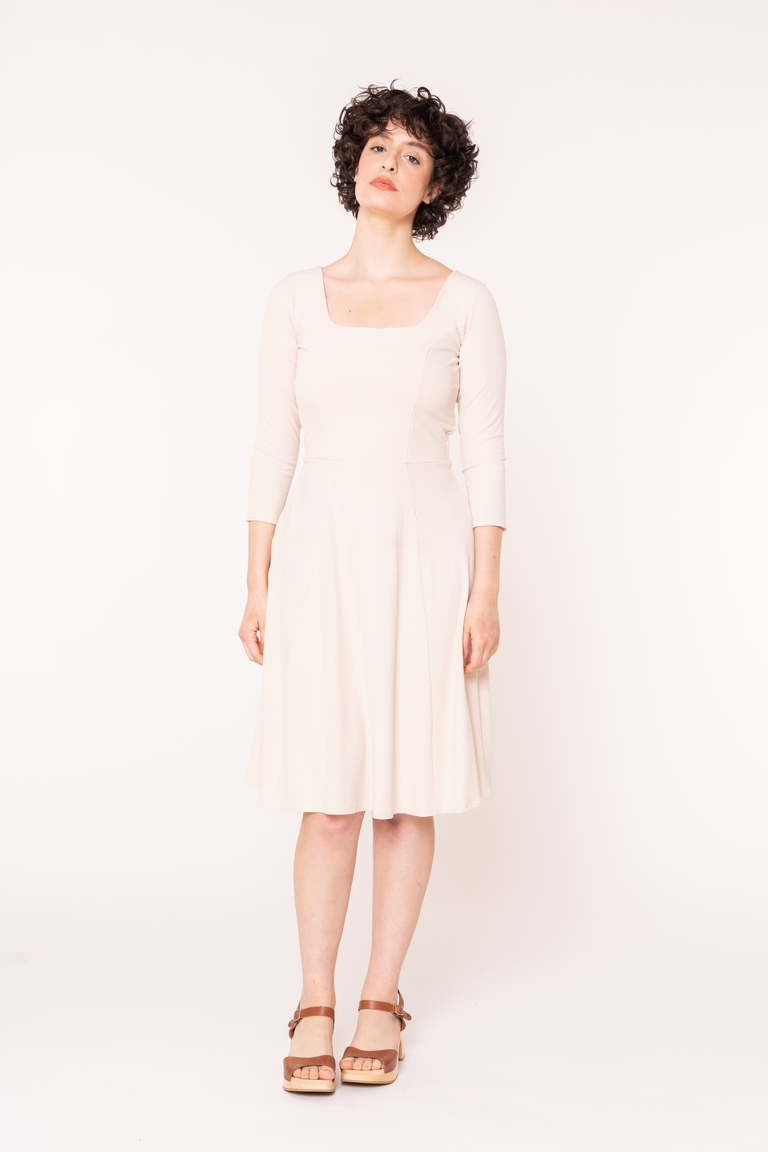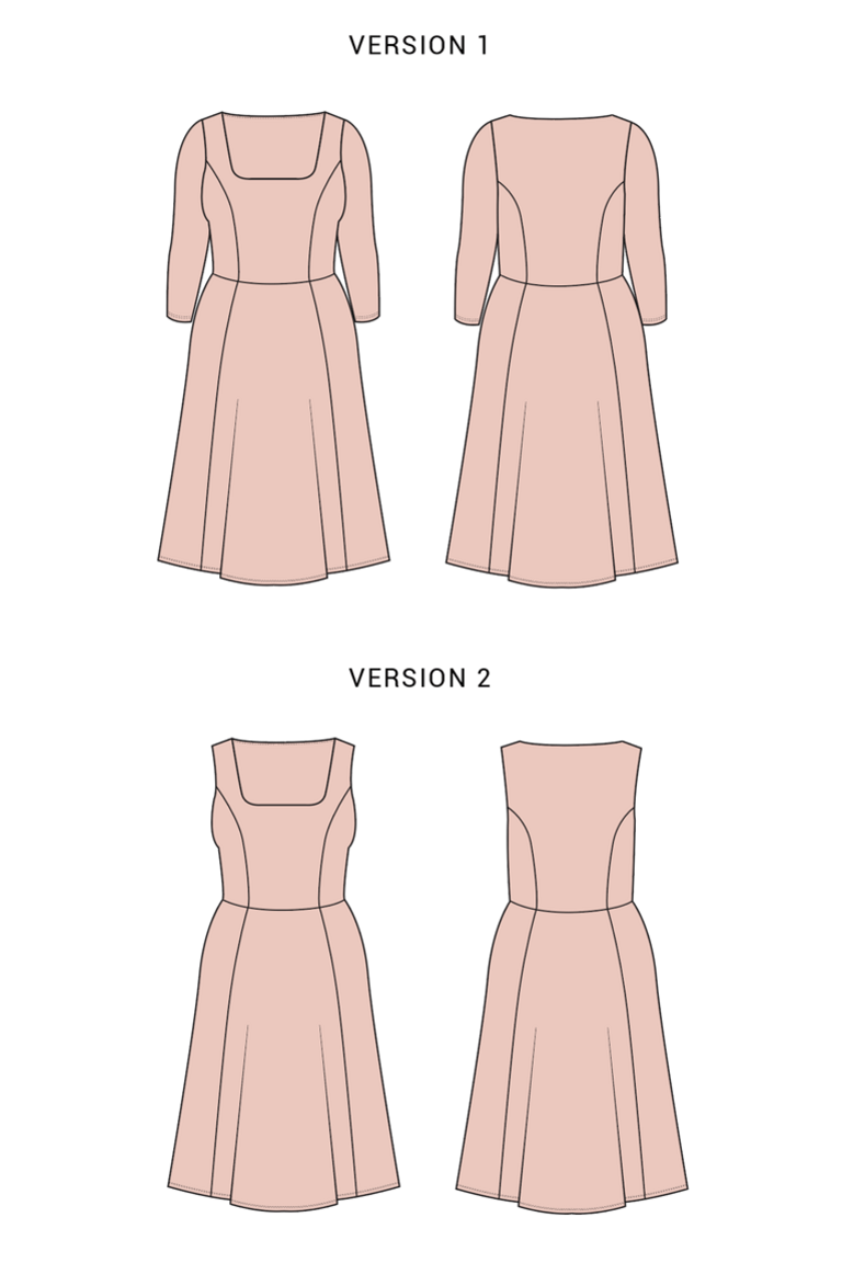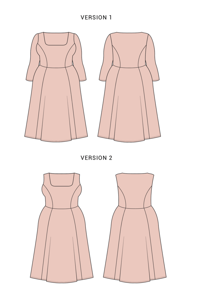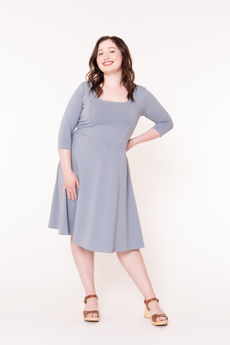 Luxsy is a knit fit-and-flare dress with two versions that each deserve a place in your wardrobe. This dress has a squared scoop neckline, princess seams at the armholes, an A-line skirt, and a lined bodice. You can wear this dress in all seasons because version 1 features 3/4-length sleeves and version 2 is sleeveless.