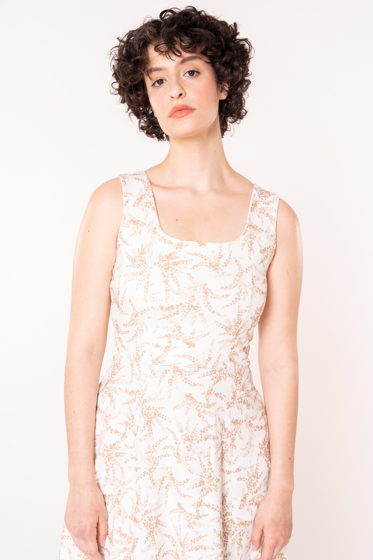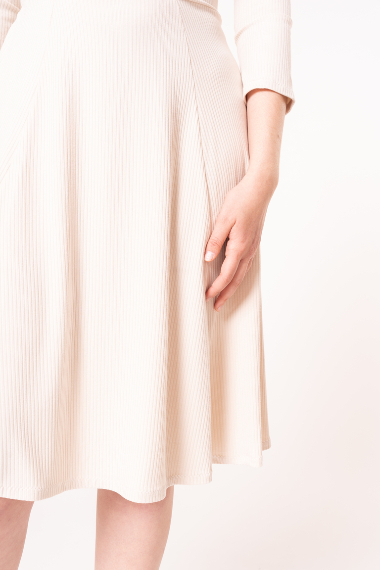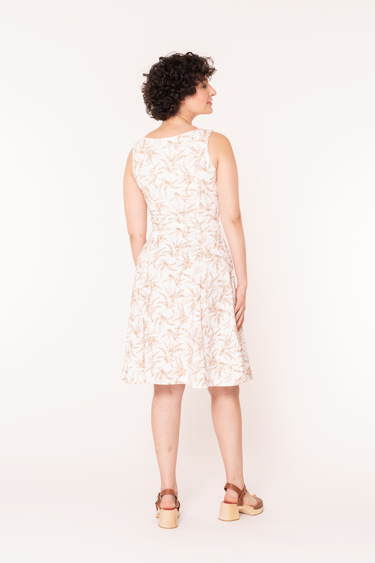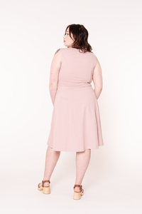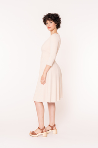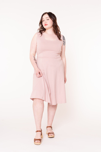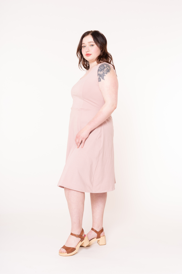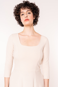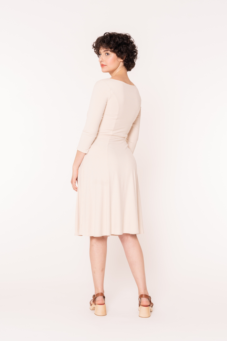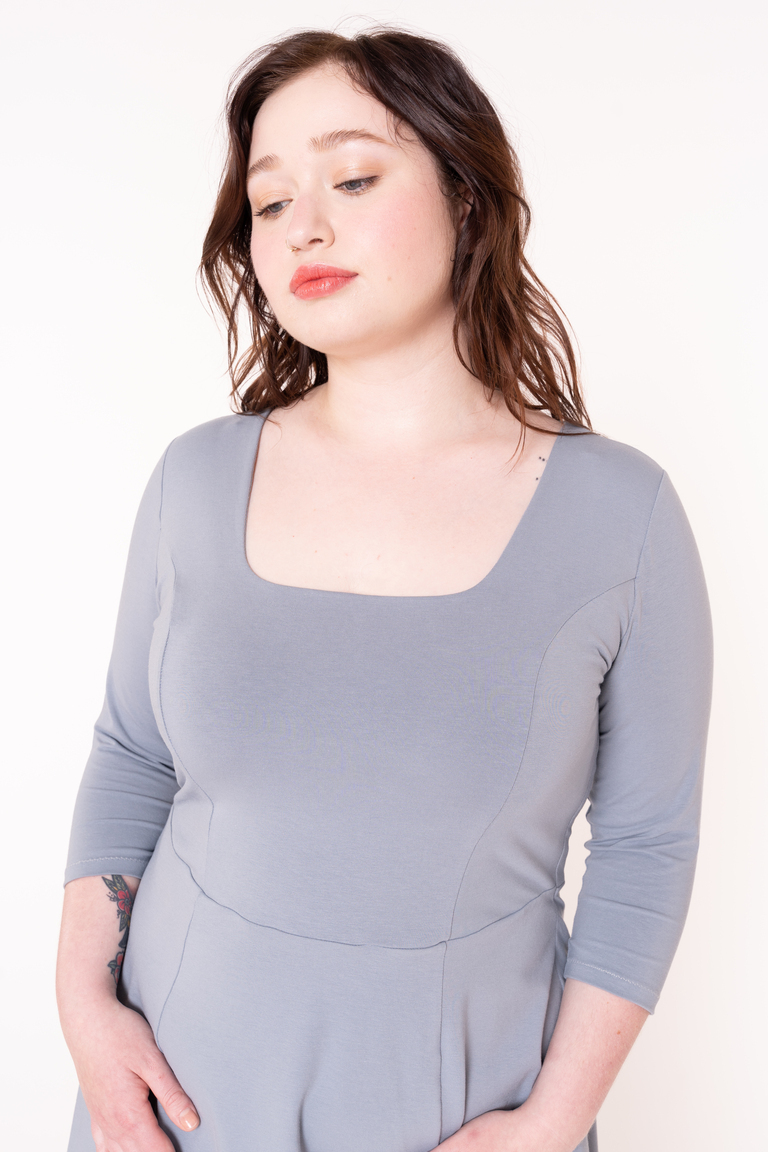 Luxsy is a knit fit-and-flare dress with two versions that each deserve a place in your wardrobe. This dress has a squared scoop neckline, princess seams at the armholes, an A-line skirt, and a lined bodice. You can wear this dress in all seasons because version 1 features 3/4-length sleeves and version 2 is sleeveless.