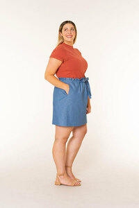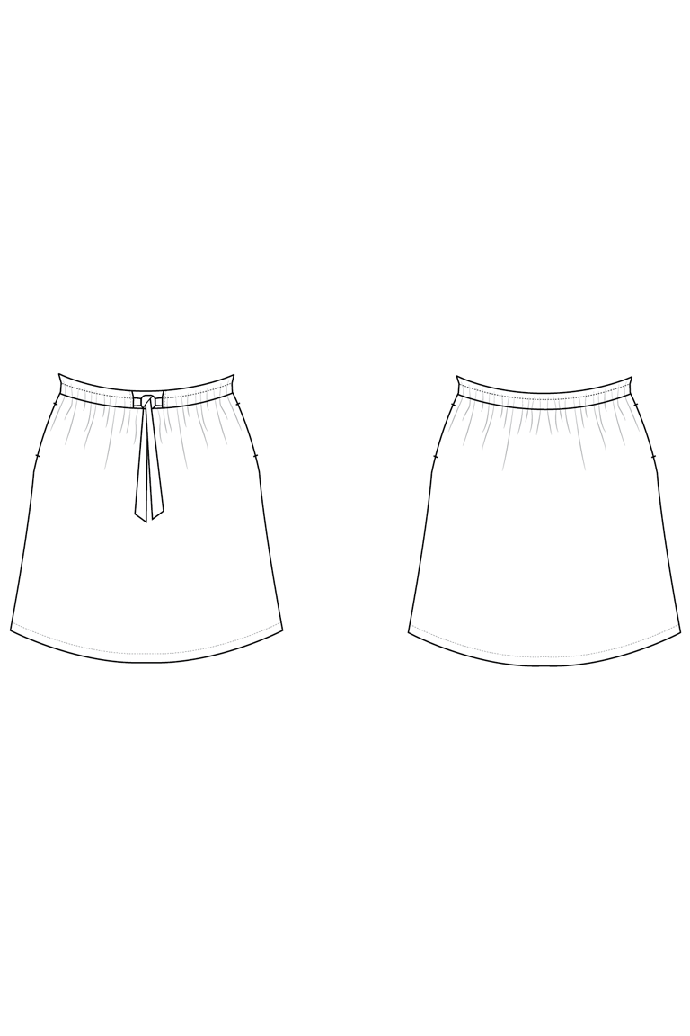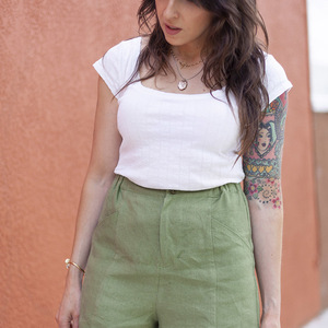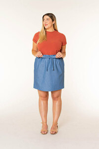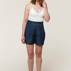 The Miller shorts are perfect for fabric chameleons since they can be made in woven or knit fabrics, and they sew up quickly. A clever elasticized tie secures the paperbag waistband, and wide leg openings and inserted pockets make these shorts stylish and comfortable.