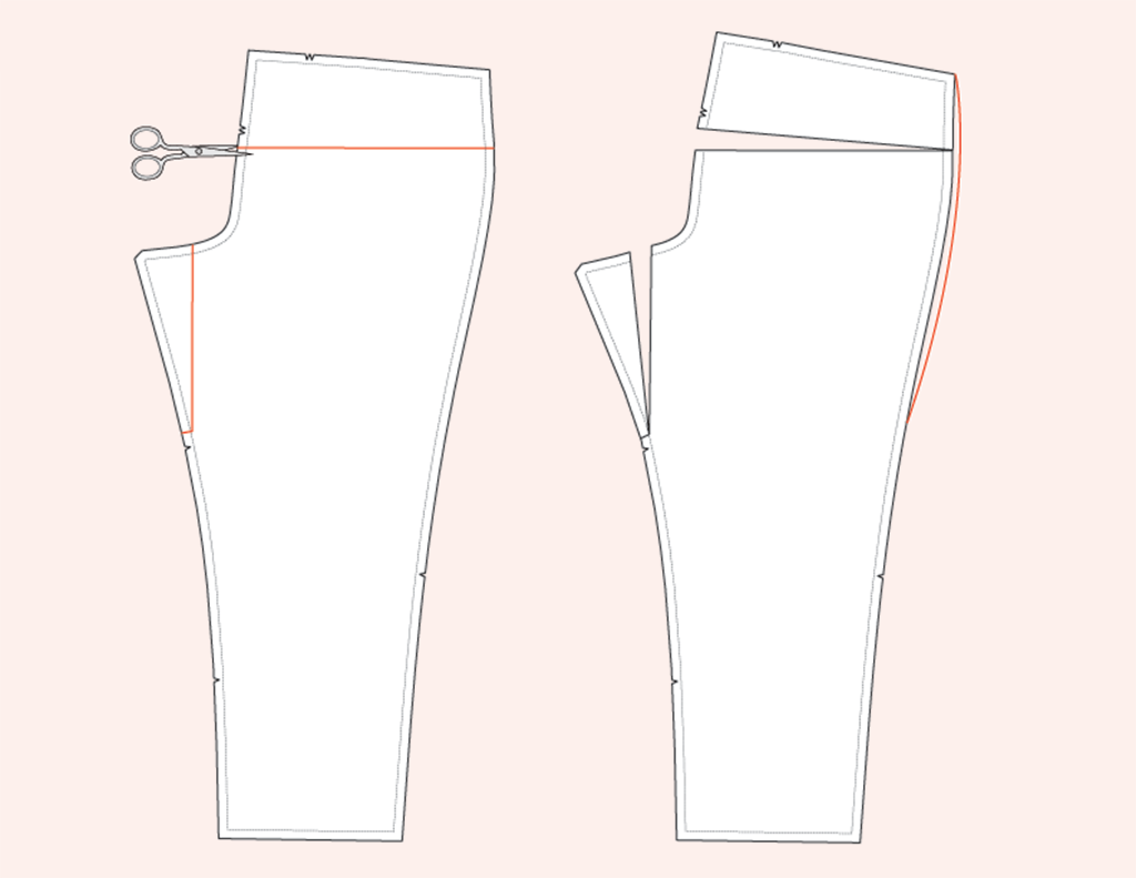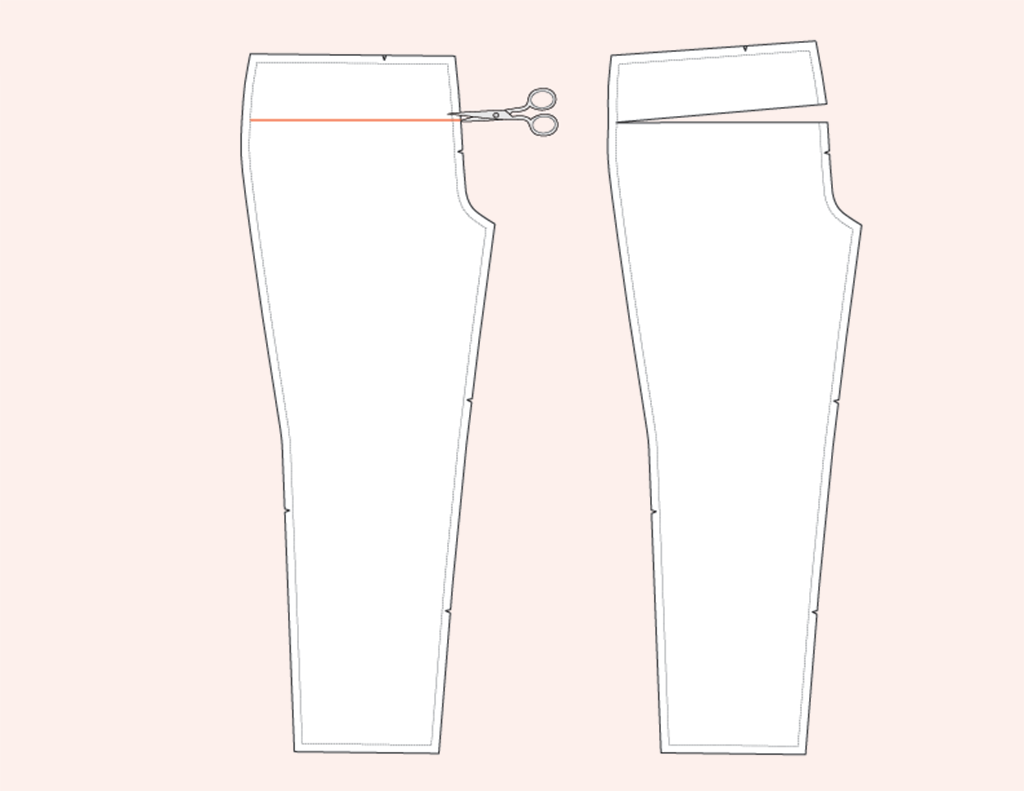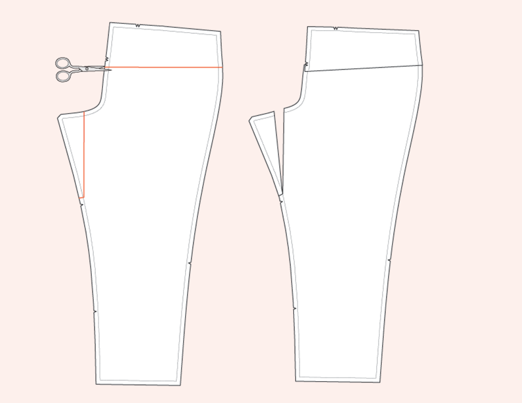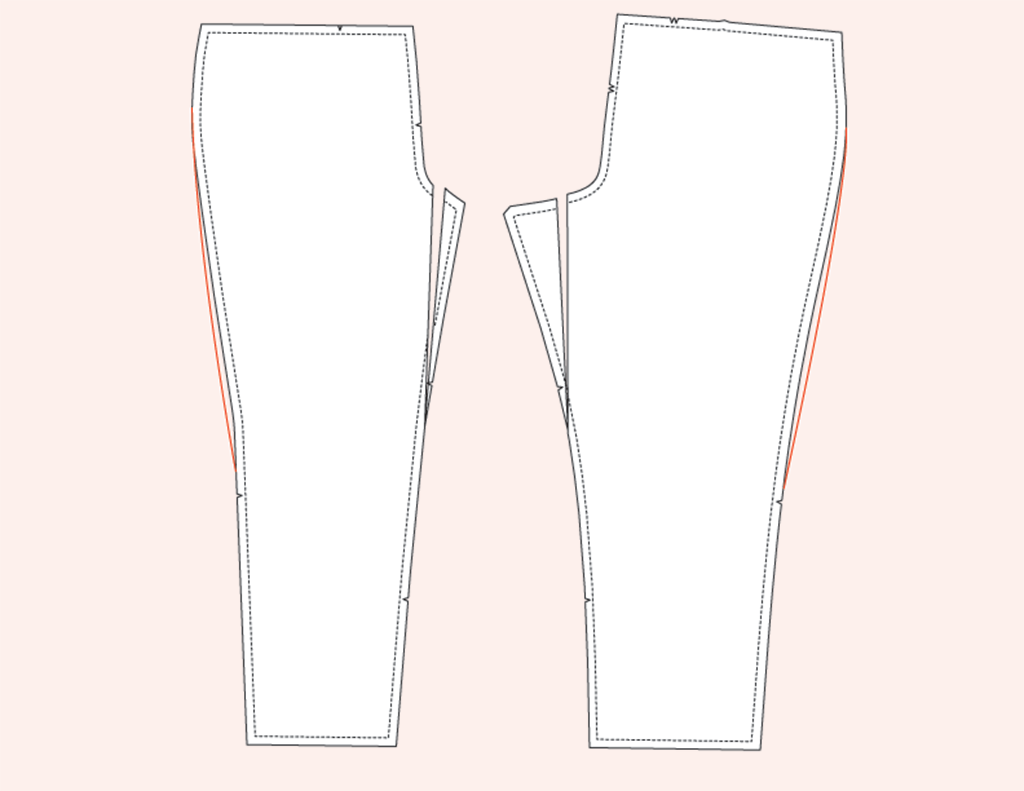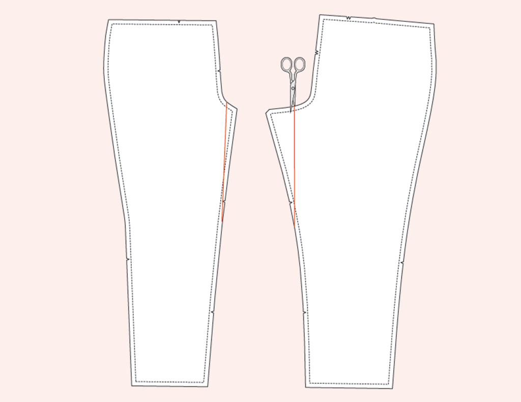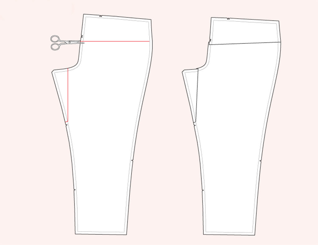- Removing a wedge at the back leg inseam.