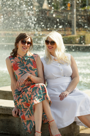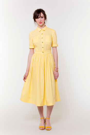 Laurel is wearing the Reed dress in a size 8. We added 1/2" to the length and made a narrow shoulder adjustment. Her measurements are bust: 37" (94 cm), waist: 30" (76.2 cm), hip: 42 1/4" (107.3 cm), and she is 5'9" (175.3 cm) tall.