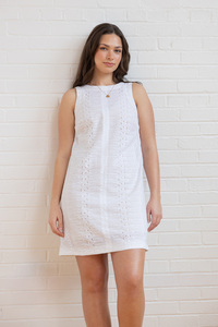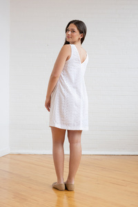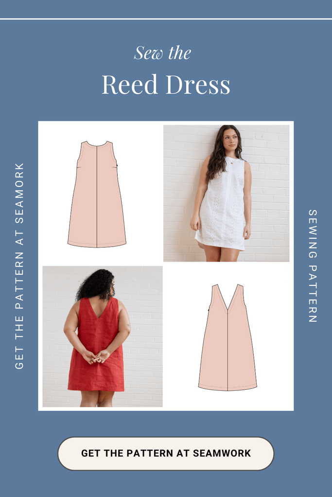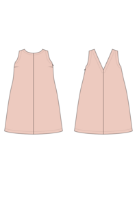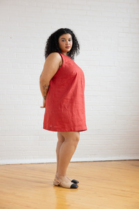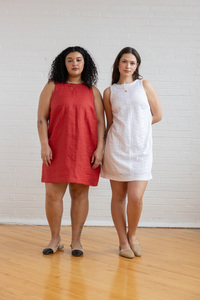 The Reed dress sewing pattern offers a timeless shift silhouette with a flattering carved armhole. It features a high round neckline at the front and a deep V-neckline at the back for an elegant touch. The dress is fitted through the bust with a slight A-line shape through the body, and bust darts provide shaping. An all-in-one facing finishes the neckline and armholes, while a side invisible zipper adds a sleek, polished finish. The hemline ends mid-thigh for a stylish, versatile look.