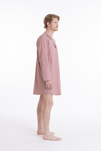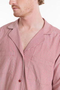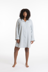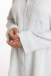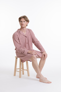 Leif is a classic woven pajama set with a relaxed, gender-neutral fit. The button-up top offers a straight, easygoing silhouette with a curved notch collar, long sleeves finished with cuffs, and two chest pockets for storing bedtime snacks.