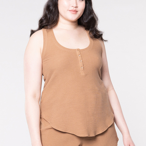 The Cal set includes a racerback tank top and semi-fitted boxer shorts. The tank has a scoop neckline, a placket for snaps or buttons, and a curved hem. The shorts have a faux fly.